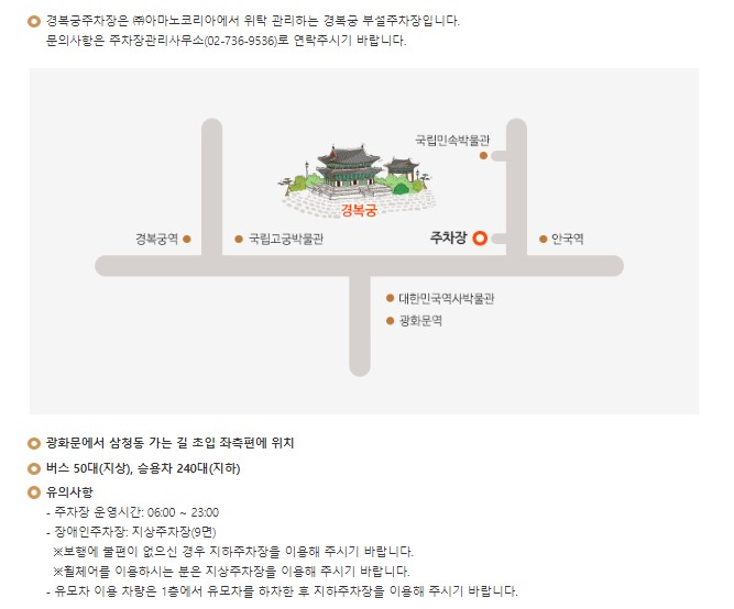 아무래도 경복궁은 경복궁역이나 광화문역에서의 접근성도 편리하다 보니 일반 대중의 주차장이 협소합니다. 경복궁 주차장의 승용차 주차면수가 240대 밖에 안되니 항상 복잡한 편입니다.