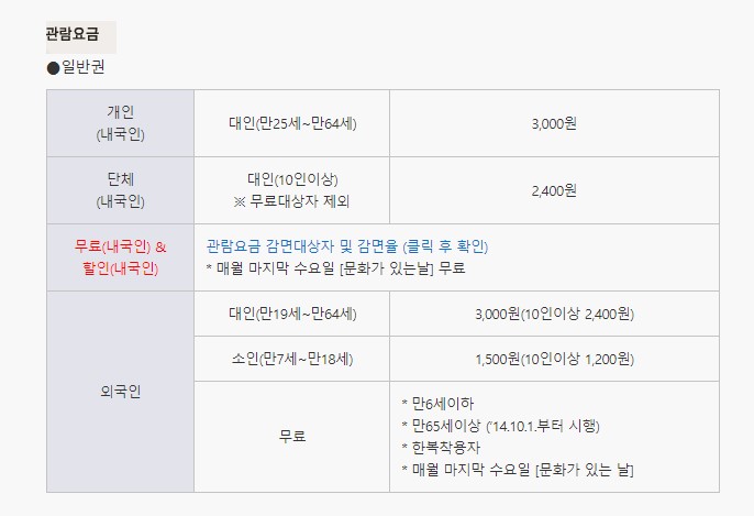 한복을 착용하거나 매월 마지막 수요일에 방문하면 무료로 관람이 가능합니다.