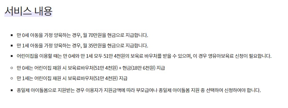 * 어린이집을 다니지 않는 가정보육 아이라면 만 0세까지 매월 70만원 현금지원